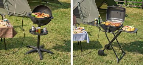 「(野電)エレキャン・ファミリーエレグリル」は、調味料や飲み物が置ける便利なカップホルダー付き。スタンドは取り外し可能なため、卓上BBQも楽しめる。