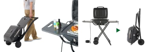 「(野電)エレキャン・エレグリルPRO」はキャスター付き。野外でもラクに持ち運べる。プレートの両サイドにはテーブルが付いているため、調味料や食材を置ける。