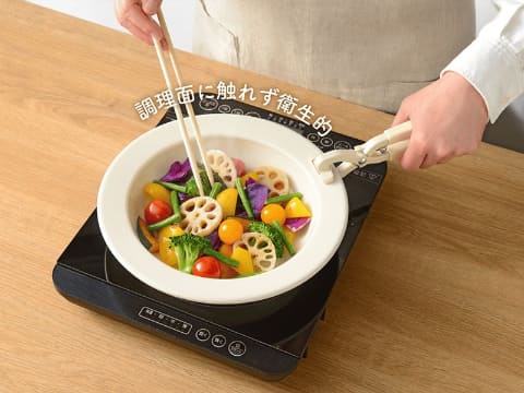 フライパンにハンドルがないため、別売の「Hetta! お皿パンつかみ」を使って調理する。調理する。価格は1,980円。