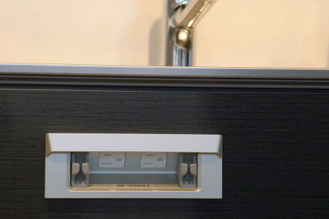 水栓の隣に配置されているのは「きれい除菌水」の生成器。水を電気分解して次亜塩素酸を含む除菌水を作り出す仕組みとなっている。ミスト状のきれい除菌水を吹きかけることで、排水口の網カゴのヌメリを抑えたり、まな板や包丁、布巾の除菌ができるという。こちらもタッチレスで使用可能。