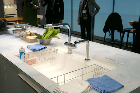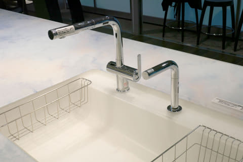 濡れた手で水栓を触らずに済むため、水栓が汚れにくいのもポイント。またL字形状のため、一般的な斜めに伸びている水栓と比べて大きな鍋が洗いやすいとのことだ。