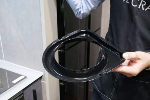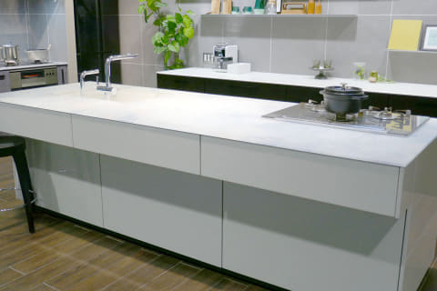 そしてザ・クラッソの最大の特徴ともいえるのが「クリスタルカウンター」だ。透明度の高いエポキシ樹脂製で、表面をつや消し仕上げにすることですりガラスのような質感に仕上げている。光を反射するため、キッチンを明るく見せるのにも一役買っている。