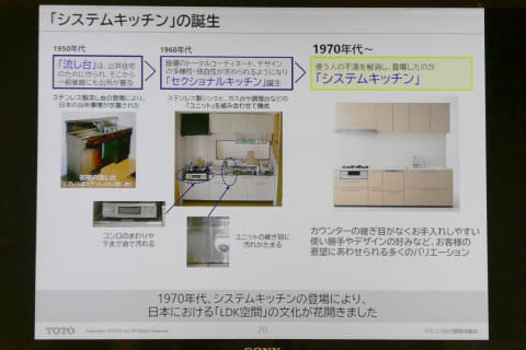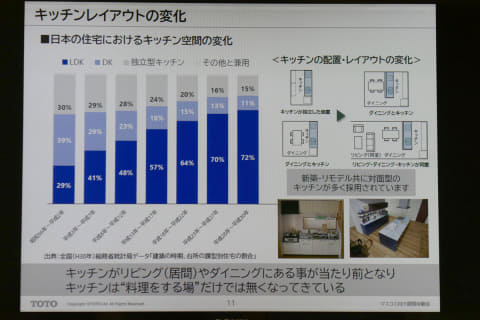 キッチンがリビングと同じ空間に設置されることで、生活空間に調和するデザインが求められるようになったほか、共働き家庭の増加などによりキッチンを利用する人数が増え、「時短」や「共同作業のしやすさ」といったニーズが高まるなど、時代に合わせてキッチン空間も変化してきた。