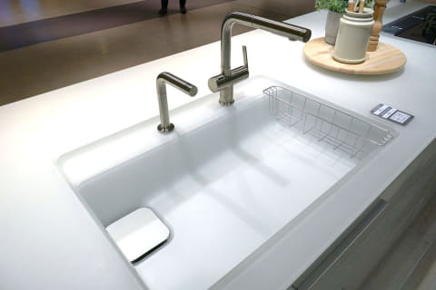 シンクは排水口に向かって傾斜が付いた「スクエアすべり台シンク」を採用する。シンクに落ちた野菜くずや食べ残しなどが排水口に集まりやすい設計だ。排水口の網かごにも傾斜を設け、ゴミが1カ所に集まりやすいようにしている。