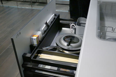 引き出し式キャビネットにも使いやすい工夫が。まず深さがしっかりとあるため、大きめのフライパンなども立てて収納でき、取り出しやすい。また、包丁入れの近くにまな板やラップなどを入れられるスペースが設けられているのも、わざわざ自分で収納グッズを揃えたりする必要がなく便利そう。オプションで収納スペースを仕切れるバーや、ツールスタンドも用意されている。
