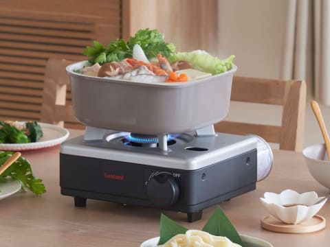燃料はカセットガスで、電源不要のコードレス設計。カセットガス1本で約2時間25分使用でき、日常使いはもちろん停電時などの有事にも役立つとしている。