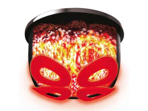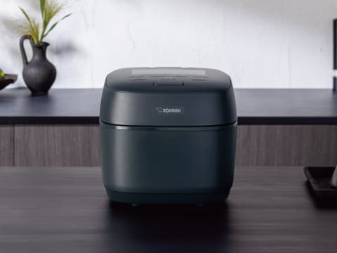 かまどの激しい炎のゆらぎを再現する「炎舞炊き」の小容量モデル。底IHヒーターを4ブロックに分けて独立制御し、対角線上にある2つのヒーターを同時加熱する「ローテーションIH構造」を採用。この構造により部分的な集中加熱が可能となり、釜内に大火力による激しい対流が発生し、お米が強くかきまぜられることで、ふっくらとした粒感と甘みを引き出すという。
