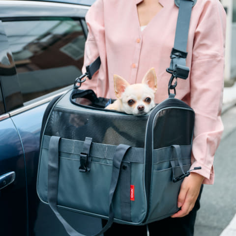気軽にペットとお出かけできるスリングに、自転車バスケットへ積載の機能を搭載した2Wayペットスリング。底面には振動吸収クッションを採用し、自転車での振動による負担を約60%軽減。もしもの転倒時も飛び出さず安全な仕様。