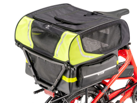 RIXEN & KAULの中でも、ペット専用のバスケットが「ドギー」。クリアフード付きで急な雨でも安心。内部にはクッションと飛び出し防止のハーネスが付いている。