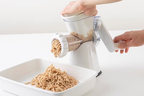 セットに含まれるヘルシーミンサーは、自宅で手軽にミンチができるハンドル式。煮た大豆をすり潰す工程が、ヘルシーミンサーを使えば簡単かつきれいに仕上げられる。目の部分は簡単に交換できる細目と粗目の2枚のアタッチメント付き。大豆以外にも肉や魚などのミンチ作りができる。