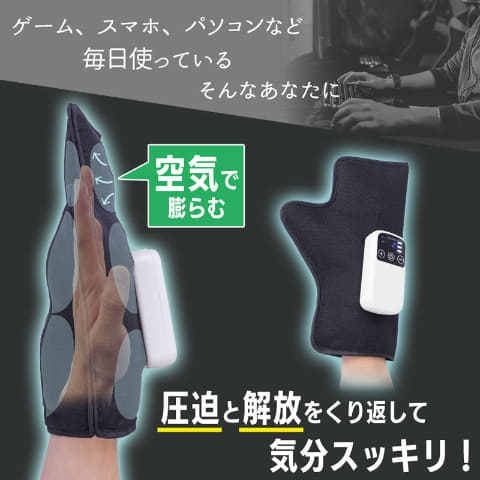 スマートフォンやパソコンの操作などで酷使した手をケアする機器。内蔵エアバッグによる「圧迫」と「解放」で手元をリフレッシュするという。1台で左右どちらの手にも対応する。