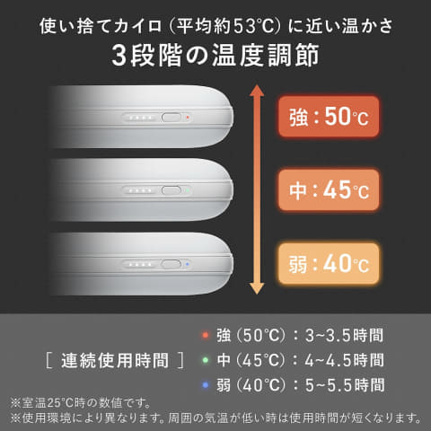 温度は40℃(弱)/45℃(中)/50℃(強)の3段階で調節可能。弱の場合には、最大5.5時間連続で発熱する。