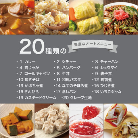 カレーやチャーハン、ハンバーグなどに加え、筑前煮やかぼちゃの煮物などの和食も調理可能。さらにカスタードクリームやクレープ生地などのスイーツまで簡単に作ることができる。