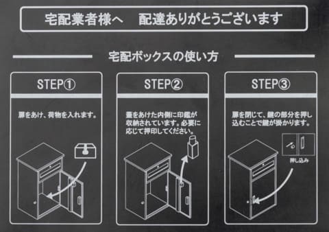 また、宅配業者が荷物を入れてから施錠まで迷わず行なえるメッセージプレート(使い方の案内)と、印鑑ホルダーも付属。外出時にも受取人/配達員双方にとってスムーズな荷物の受け取りをサポートする。