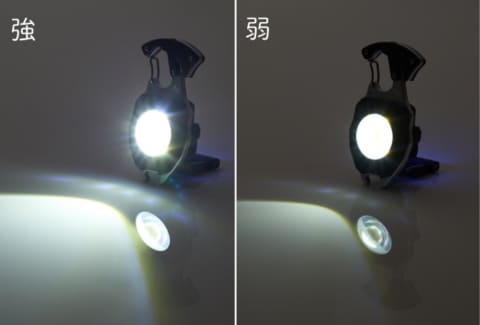 ライトは白色/暖色/赤色の3種に切り替え可能。白色と暖色には強/弱の点灯モード、赤色には点滅モードを搭載し、キャンプシーンはもちろん災害時の合図としても役立つ。常用点灯時間は約2時間(強)/約3時間(弱)。