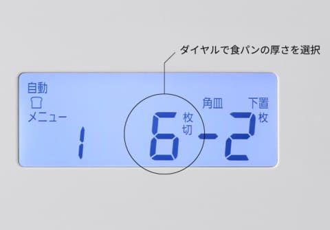 食パンの厚みと枚数に合わせたコースを設定でき、ダイヤルで「4/5/6/8枚切り」から選んでスタート。冷凍の食パンは「冷凍ボタン」を押すだけ。それぞれの厚みに合わせた焼き時間に自動調整して焼き上げる。また、焼き色も5段階(弱〜強)に調整可能。