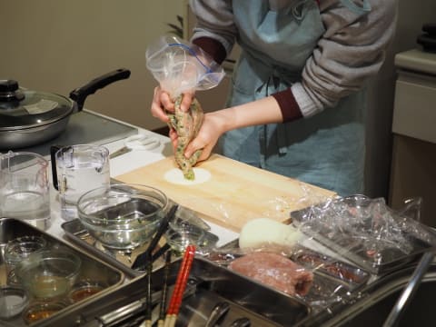 さらに、こねた後には袋の端をハサミで切り、餃子の皮の上へ、お菓子作りで生クリームを絞るような要領で、できた餃子の餡を絞り出していった。