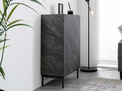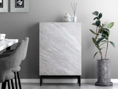 取っ手や装飾をなくしたシンプルなシルエットとシックな石目調で、キャビネットのようにデザインされている。そのため、リビングに設置しても違和感がなく、モダンな空間に馴染みやすい。