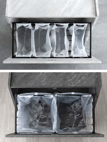 容量は最大90L。本体内には、最大4つのゴミ袋を設置でき、ゴミの分別がしやすい。必要に応じて45Lのゴミ袋を2つ並べて使用することも可能。