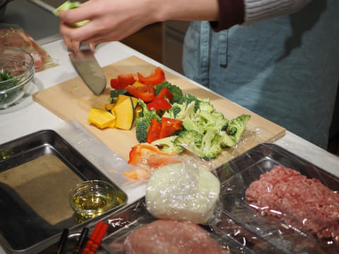作ってくれたのは、「豚肩ロースと野菜のオリーブオイル焼き」。あらかじめ袋の中にオリーブオイルや調味料などをなじませた肉を用意。この肉をグリル皿に置いて、周りに一口大に切っていったブロッコリーやカボチャ、パプリカなどを添える。