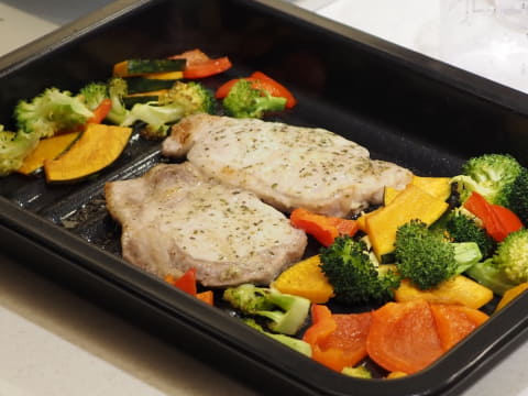 そうしているうちに「豚肩ロースと野菜のオリーブオイル焼き」が完成。