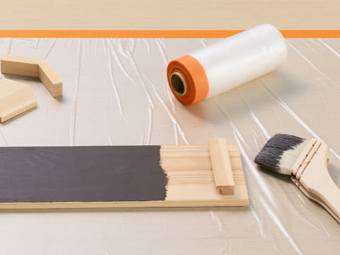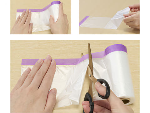 汚れから保護したいテーブルや床、壁などにマスキングテープでシートを固定し、シートを広げることで汚れから守る。
