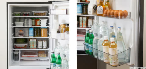 冷蔵室の容量は204Lで、高さを調節できるガラス棚やチルドルームを搭載。また、ドアポケット上段の高さも調節可能で、背の高い飲み物をドアポケットの上段と下段に収納できる。