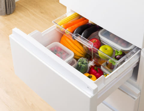 野菜室を中央に配置しているため、キャベツなどの重い野菜もかがまずに出し入れ可能。2段式で整理しやすく、野菜を頻繁に調理する人や自炊頻度が高い人におすすめとしている。