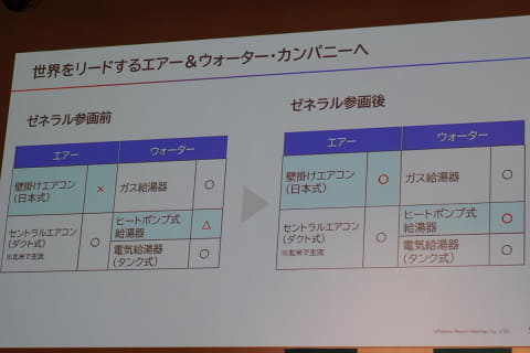 リーム社は、主に海外で見られるダクト式の空調を強みとし、一方でゼネラルは、日本などの壁掛けの室内機が主力。これを互いの市場の販売網で流通可能にすることや、グローバル展開によるサプライヤー集約などを、グループ加入のシナジーとして挙げている。