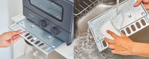 パンくずトレイはスライド式で取り外しやすく、丸洗いできるため手入れも簡単とする。