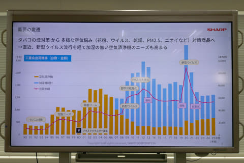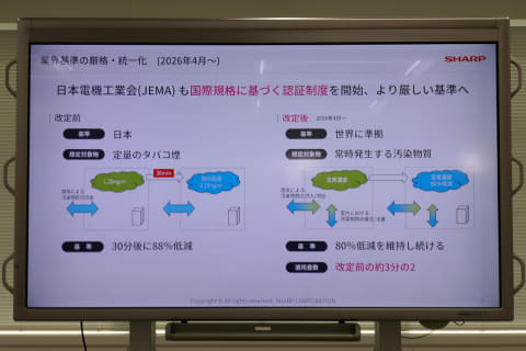 しかし、これまではタバコの煙を想定した基準だったものが、花粉やPM2.5、ハウスダストなど、より実生活に即した有害物質の除去が基準となったことで、シャープは「当社としては空気清浄効果を体感しやすくなるという視点で前向きに捉えています」としている。