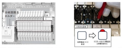 施工時の作業性と安全性に配慮した構造も特徴とする。配線作業時にカバーを外した状態でも負荷名称を確認できる構造で、作業の効率化に貢献。加えて、電圧設定のミスを防ぐため、分岐ブレーカー取り付け部の構造を見直し、200V通電確認のチェックを容易にした。