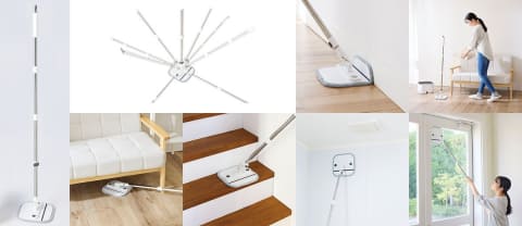 モップのヘッドは360度回転する仕様で、壁際や部屋の隅にもフィットする。モップは自立するため、作業中に手を放すこともできる。ハンドルを倒せば、ソファ下などの低いスペースも掃除しやすい。