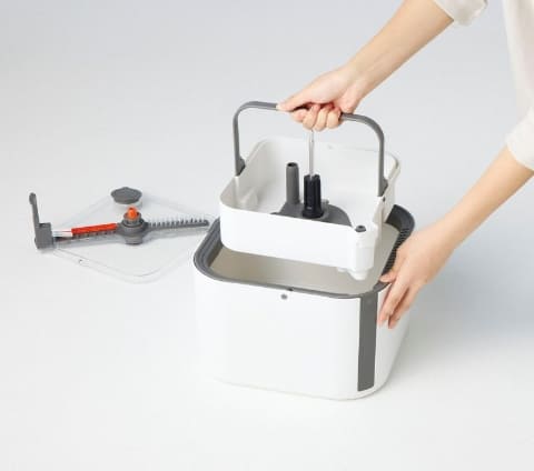 モップを洗浄できるバケツを付属した回転式モップ。洗浄タンクと汚水タンクを分離した構造を採用し、常にきれいな水で床を拭ける。電気は不要で、思い立ったときにすぐ使えるとしている。