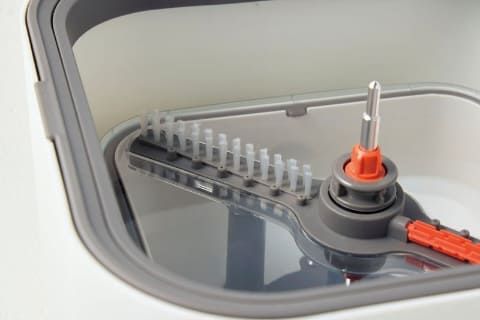 モップをセットして上下に動かすと、15カ所の水噴射口から水が噴き出し、モップ全体を洗浄する仕組み。バケツ容量は、洗浄タンクと汚水タンクそれぞれ2.5L。