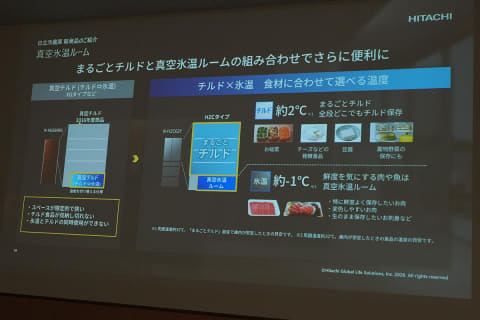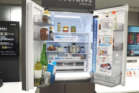 今回の新モデルで名称を新たに「真空氷温ルーム」としたのは、まるごとチルドで広いチルドスペースを確保できるようになったことから、改めて日立独自である真空による鮮度保持の機能を活用し、特に肉や魚といった鮮度が重要な食材をしっかり保存したいニーズに応えていく狙いがある。