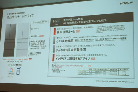 日立グローバルライフソリューションズは、約0.8気圧の「真空氷温ルーム」を採用した冷蔵庫「まんなか冷凍 HZCタイプ」2機種を2月下旬に発売する。価格はオープンで、市場想定価格は617Lモデル「R-HZC62Y」(幅685mm)が47万円前後、540Lモデル「R-HZC54Y」(幅650mm)が42万円前後。なお、いずれも指定価格(店頭で値引きされない)の対象製品ではない。
