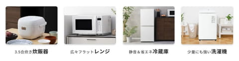 提供家電は、3.5合炊きの炊飯器「SR-KT060-W」、単機能レンジ「NE-FL1C-W」、定格内容積156Lの冷蔵庫「NR-B16C3-W」、洗濯・脱水容量5kgの洗濯機「NA-F5B5-H」。