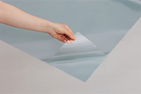 施工方法は、まずガラスをきれいに拭き、霧吹きなどでガラスの表面に水滴を付ける。水滴の付いたガラスに本品を貼る。その上からプラスチックの板などで中央から端に向けて水と空気をすき出す。
