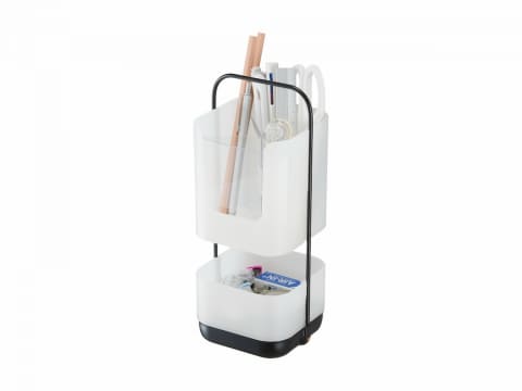 日常時にはデスクワークを快適にする多収納型ペンスタンド。筆記具や定規、はさみ、スマートフォンなど長さのある道具に加え、付箋や消しゴムなどの小物類が入るトレーを備えている。