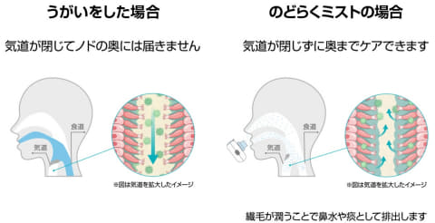 約5~25μmの極微細なミストが、うがいでは届かない喉の奥までしっかりアプローチ。繊毛の働きを守り、乾燥や不快感をやわらげることで、喉本来の防御力をサポートするという。