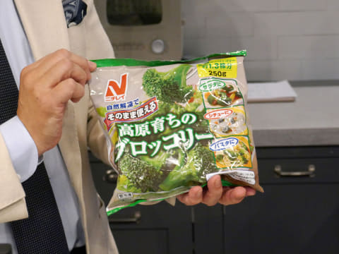 実際に冷凍ブロッコリーを使用したポタージュの調理実演を見学した。冷凍ブロッコリーを使う場合は、半解凍する必要があるが、前田先生によるとパッケージ袋に水を入れるだけでいいとのこと。袋に入れたまま水を切ればザルなども不要で手間がかからない。また冷凍だけでなく、生のブロッコリーでも作れるそうだ。