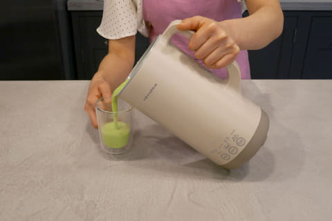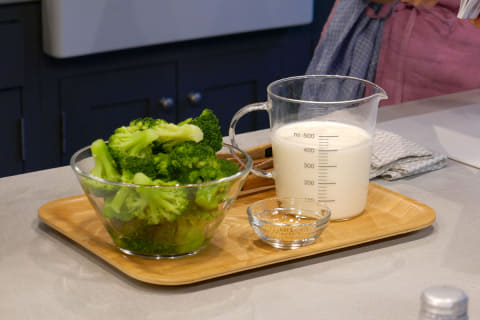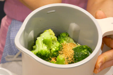 ブロッコリーを本体に入れたら、牛乳、コンソメを順に入れ、モード設定をしてスタートボタンを押すだけ。慣れれば準備に1分もかからないだろう。あとは約25~30分待つだけでポタージュが完成する。