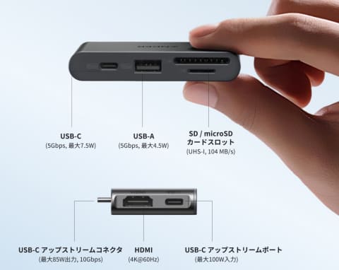 着脱式USB Type-Cハブの搭載ポートは、HDMIポート×1、USB Type-Cポート×3、USB Type-Aポート×1、SD/microSDカードスロット×1。なお、着脱式USB-Cハブは、本体装着時はドッキングステーションの一部として機能し、また一部ポートは本体装着時には使用できない。