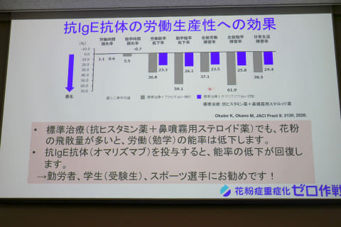 花粉症の治療法には薬物療法のほか、鼻粘膜の過敏性を抑えるレーザー手術や、アレルゲンを投与する根治的治療の舌下免疫療法などがある。また、新しい治療法として皮下注射の抗IgE抗体療法が登場。これは標準治療を行なっても症状が残る重症患者に有効とのこと。鼻水や鼻づまりといった花粉症の症状による仕事や勉強能率の低下も回復するため、受験生などにもすすめられるという。