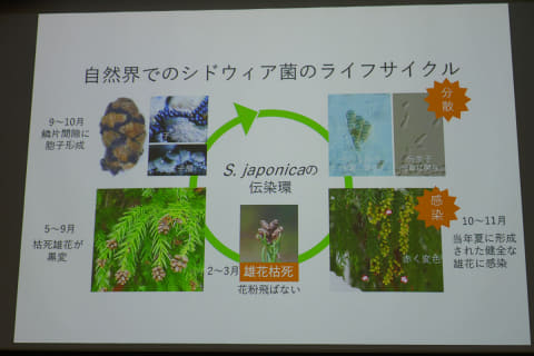 高橋さんによると、シドウィア菌の胞子を培養し、より広がりやすくするために乳剤などを添加したスギ花粉飛散防止剤を地上で散布したところ、スギの花粉量が8~9割減少する結果が得られたという。