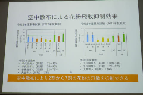 また、より広範囲に剤を撒くため、空中散布技術も開発。無人ヘリコプターによる散布では2~7割の雄花が枯死し、無人/有人ヘリコプターによる空中散布試験では、同様に2~7割の花粉飛散抑制効果が確認されている。