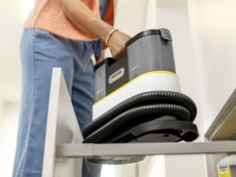 布製品を水洗いできる清掃機器。洗浄水を吹き付けて繊維の奥の汚れを浮かせ、その汚水ごと強力に吸引することで、洗濯機で洗えないソファやカーペット、マットレス、車のシートなどを洗浄できる。