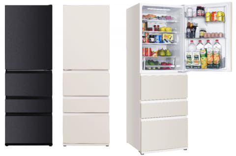本体サイズは600×668×1,810mm(幅×奥行き×高さ)。重量は73kg。定格内容積は370L(冷蔵室204L/野菜室70L/冷凍室96L)。年間消費電力量は329kWh/年。動作音は約23dB。カラーはグレーとベージュの2色展開。