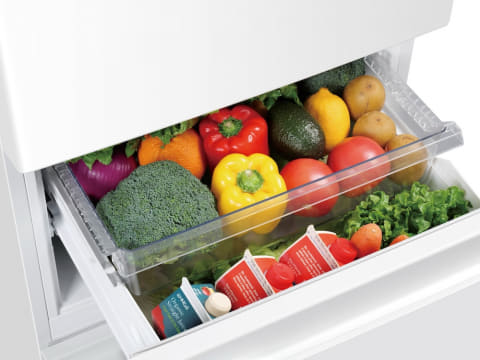 野菜室はバスケットを備え、野菜の大きさに応じて整理しやすいほか、冷凍室は容積が68L、上段2段がバスケットで下段が冷凍ケースという3段構成。
